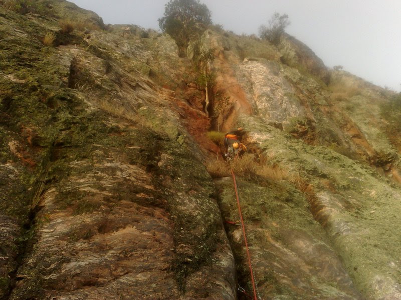 Começamos a escalar às 6:20 da manhã, acompanhando a grande fenda que se estende até um trepa mato, a uns 80 mts de altura, montando algumas ancoragens para que os outros pudessem subir a via em segurança, e continuava tocando pra cima para deixar pelo menos uma corda fixa para o resto da galera jumarear. Mesmo com este ânimo todo e agilizando a subida pra galera, ficou um pouco complicado de subir os equipos, pois a própria parede gerava muito atrito e estávamos com simples mochilas cargueiras, que podiam se rasgar facilmente pelo simples arrasto na pedra. Depois de uma fatigante subida chegamos todos ao grande platô por volta de 11:00 hs, onde pudemos repor as energias saboreando o incrível arroz carreteiro feito pelo Negão, que infelismente não pode usufruir do próprio feito!